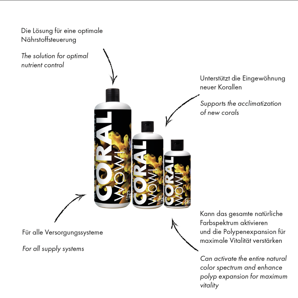 CORAL WOW! enhances the color intensity of SPS corals, promotes maximum polyp expansion, and strengthens natural color pigmentation.
